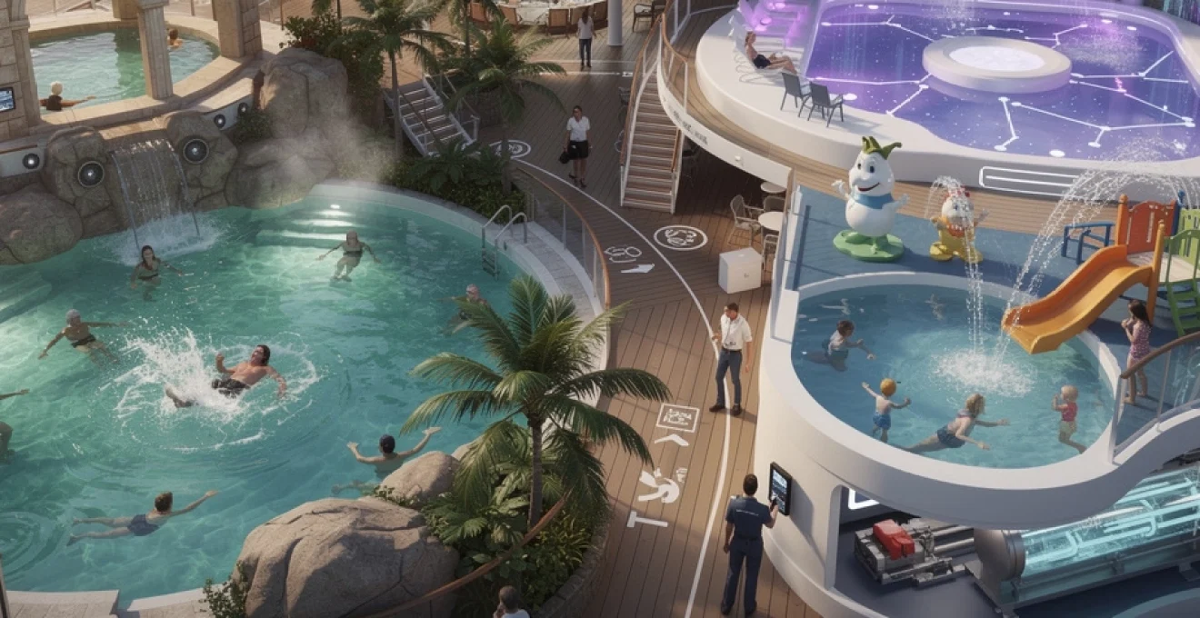 Plusieurs navires récents illustrent la manière dont les piscines à thème peuvent devenir la signature d’une compagnie. Certains paquebots ont ainsi été conçus autour d’un véritable « quartier aquatique », avec plusieurs zones distinctes : espace famille, zone bien-être adulte, aire extrême pour les amateurs de sensations fortes. Chacune de ces zones porte une identité visuelle et sonore propre, mais l’ensemble reste cohérent au regard de l’univers global du navire.